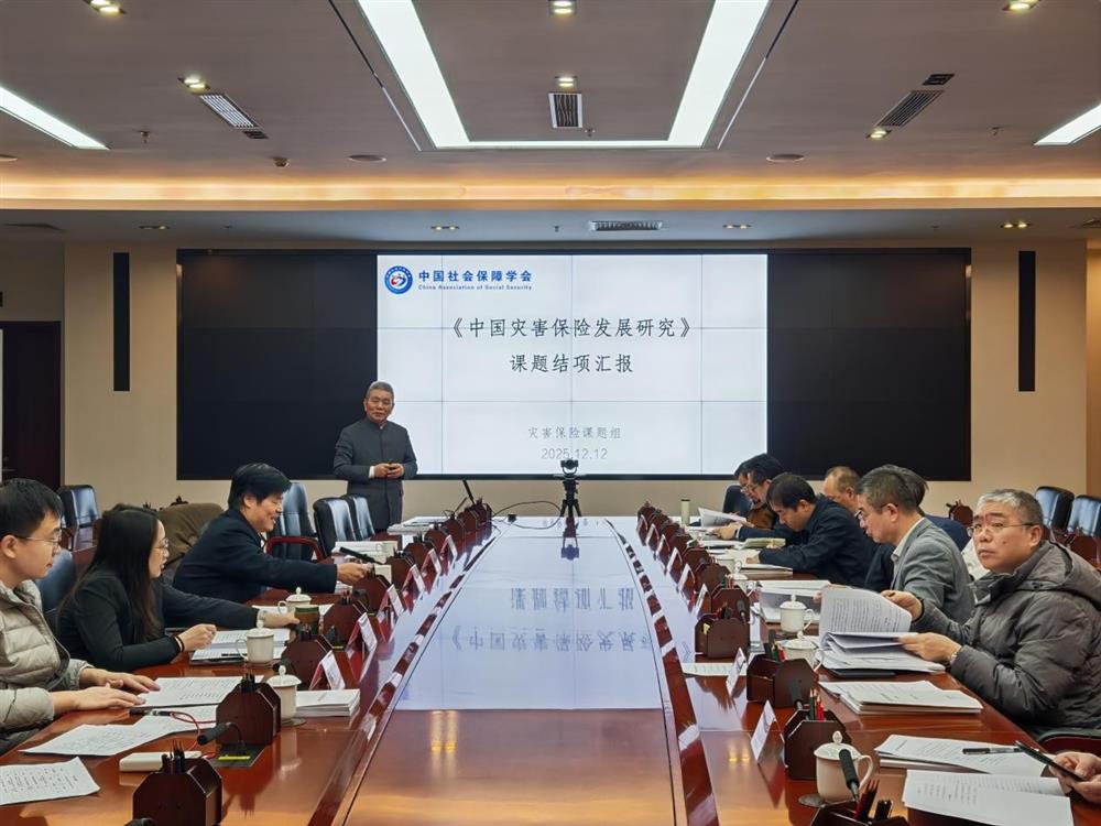 2025年12月12日,由中国社会保障学会承担的“中国灾害保险发展研究” 课题结项会在应急管理部国家减灾中心召开。中国社会保障学会会长郑功成教授、商业保险研究分会会长王绪瑾教授、商业保险研究分会秘书长宁威参加会议。应急管理部国家减灾中心相关负责人和来自北京师范大学、中共中央学校(国家行政学院)、对外经济贸易大学、首都经济贸易大学、中国科学院地理科学与资源研究所、中国安全生产科学研究院、中国再保险(集团)股份有限公司、中国人民财产保险股份有限公司、中华联合财产保险股份有限公司的评审专家出席会议。会议开始前,国家减灾中心党委书记郭宏伟、国家减灾中心主任石峰、国家减灾中心纪委书记李敏等和郑功成会长进行了专门交流。评审专家组组长、首都经济贸易大学农业保险研究所所长庹国柱教授主持评审交流环节。