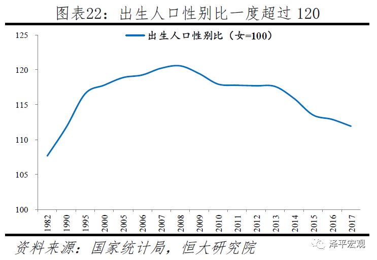 90后、00后男女性别失衡非常严重,出生人口性别比一度超过120。1982年中国出生人口性别比为107.6,1990年超过110,2000年接近118,之后长期超过120。严重失衡的出生人口性别比导致政府不得不出手干预。2011年《国家人口发展“十二五”规划》,提出2015年的出生人口性别比目标为115,这是中国首次把控制人口出生性别比纳入国家规划。2016年《国家人口规划(2016-2030年)》提出2020年出生人口性别比降至112以下,2030年降至107、即恢复到正常水平。在政策影响下,出生人口性别比从2008年的120.6开始持续下降,2017年已降至111.9。但是,即使未来出生人口性别比下降到正常范围,1980年代到2030年之间出生的人口在婚姻问题上仍将面临严重的“男多女少”性别不平衡问题。从经验上看,同龄适婚女性短缺,男性的择偶对象就会向低年龄女性转移,并可能将择偶地区范围扩大,城市男性找农村女性,富裕地区男性找欠发达地区女性,“剩男”最后沉积在低收入贫困阶层。根据2010年人口普查资料,00后男女性别比达119,男性比女性多近1300万;90后男女性别比达110,男性比女性多近900万。80后、70后未婚人群男女性别比分别为137、308。如果算上离异、丧偶的单身情况,80后、70后单身人群的男女性别比分别为136、206。