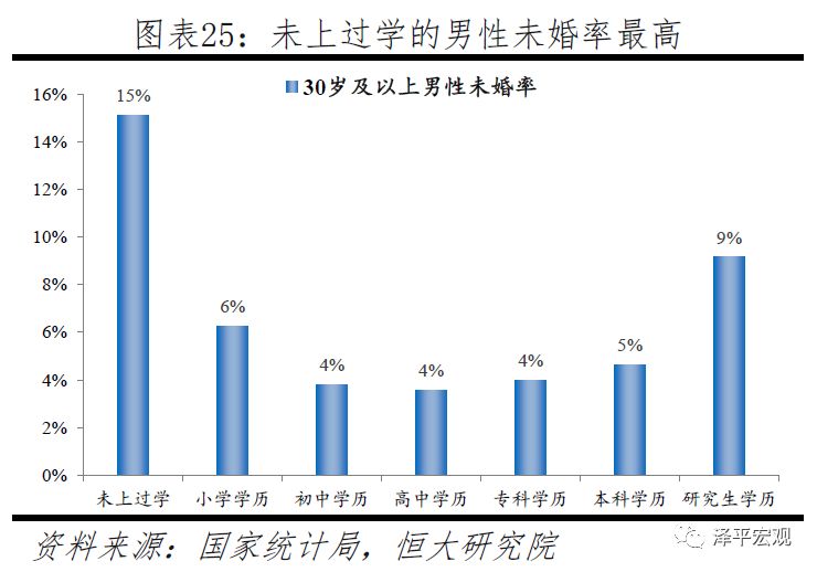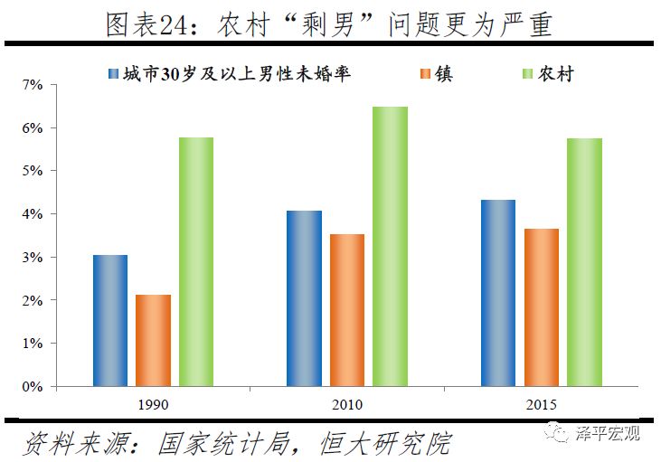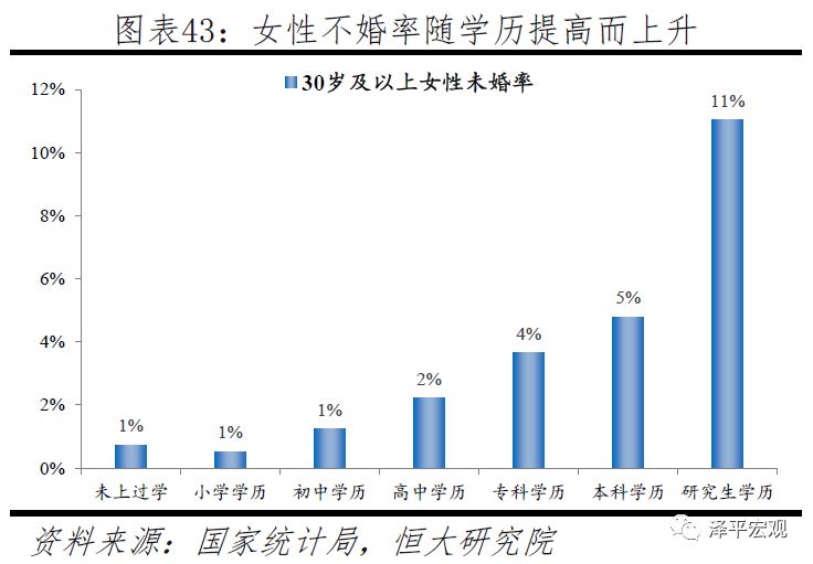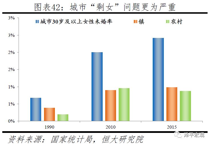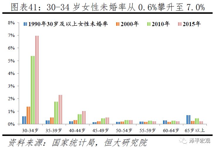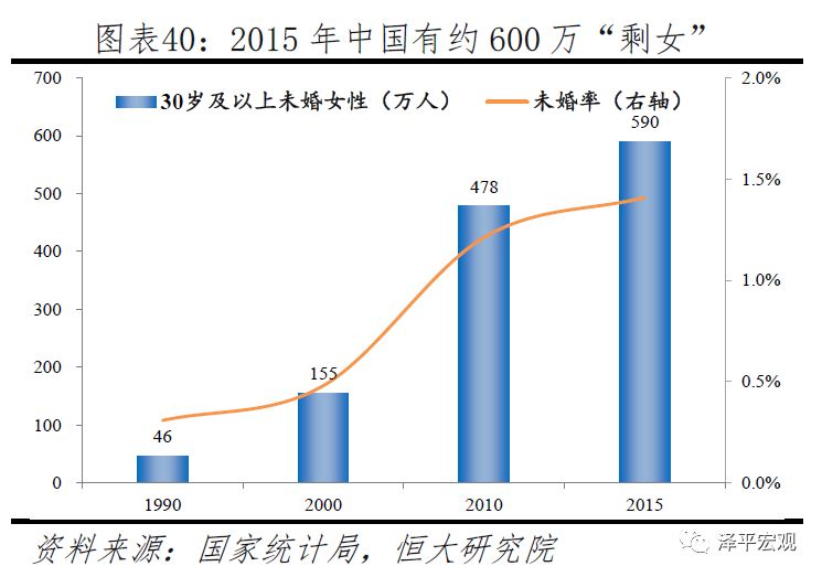 1990年中国30岁及以上未婚女性仅为46万,2000年超过154万,2015年攀升至590万;其中,30-34岁女性未婚率从0.6%攀升至7.0%。从受教育程度看,30岁及以上未婚女性中具有小学及以下学历、初中学历、高中学历、大学及以上学历的人数占比分别为22.3%、37.2%、19.1%、21.5%。其中,虽然30岁及以上未婚女性中,具有研究生学历的人数占比仅为1.9%,但30岁及以上研究生学历女性未婚率高达11%,远高于本科学历及以下女性未婚率的5%。从城乡分布看,“剩女”近6成在城市。2010年30岁及以上未婚女性在城市、建制镇、乡村的分布分别为49.4%、14.3%、36.3%,2015年变成56.6%、16.2%、27.2%。2015年城市30岁及以上女性未婚率为2.4%,明显超过建制镇的1.0%、农村的0.9%。