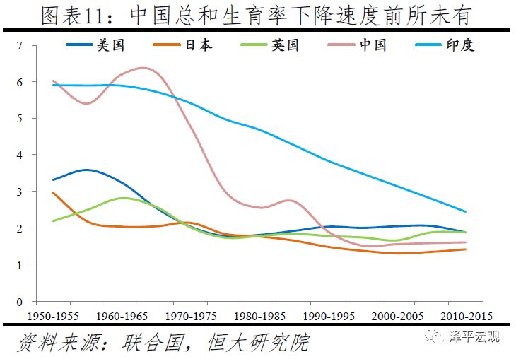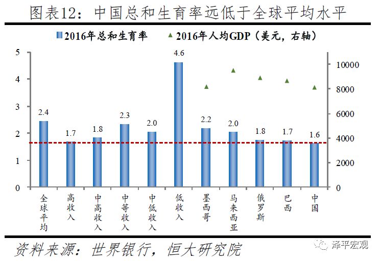 2)中国生育率下降速度在国际上前所未有,当前不仅远低于2.45的全球平均水平,还低于1.67的发达国家水平。根据联合国统计,1950-2015年美国总和生育率从3.3降至1.9,日本从3降至1.4,印度从5.9降至2.4,均远小于中国的总和生育率从6到1.6的降幅。2016年中国总和生育率为1.62,在全球位居倒数,不仅远低于2.45的全球平均水平(2.45),还低于1.67的高收入经济体水平。与墨西哥、巴西、马来西亚、俄罗斯等人均GDP相近的国家相比,中国总和生育率仍然偏低。