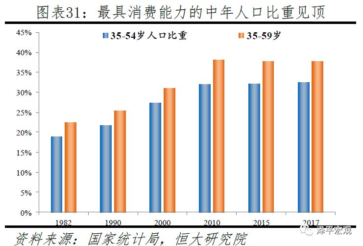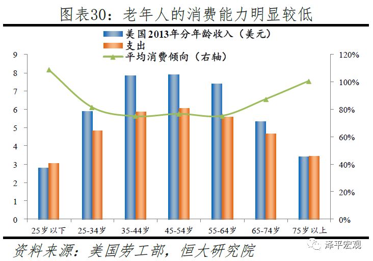 以美国为例,美国消费水平最高的是35-44岁、45-54岁,其次是55-64岁,三个年龄段平均消费倾向比不到80%,其他年龄段消费水平较低,但平均消费倾向较高,25岁以下、75岁以上的平均消费倾向超过100%。从中国看,由于退休多在60岁之前,我们以35-59岁计算,2010-2015年35-59岁人口比重从38.1%降至37.8%,即消费能力最强、但消费倾向较低的中年人口比重已经见顶,意味着消费增速将逐渐放缓。