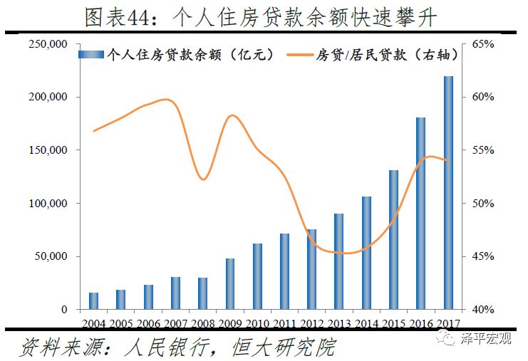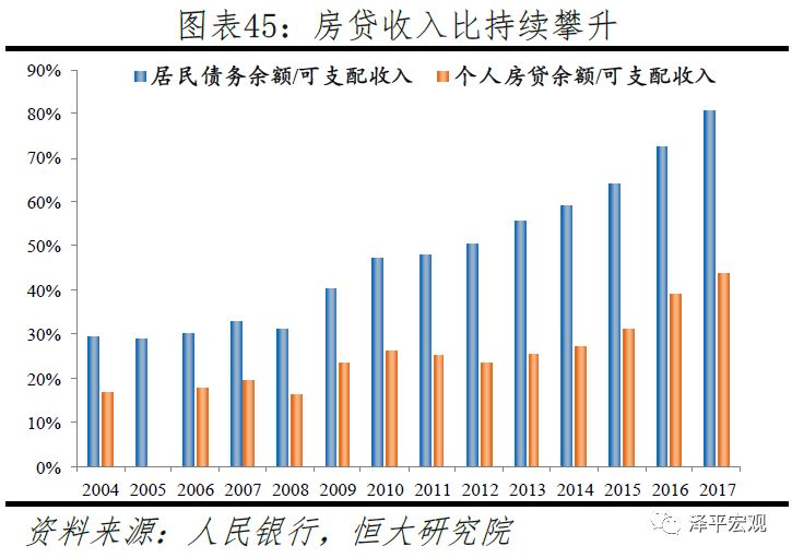 从以房贷为主的居民债务数据看,2004-2017年中国个人购房贷款余额从1.6万亿元增至21.9万亿元,增长13.7倍,占居民贷款余额的比例大致在50%以上,2017年为54%。房贷收入比(个人购房贷款余额/可支配收入)从17%增至44%,带动住户部门债务收入比(居民债务余额/可支配收入)从29%增至80%。需要指出的是,现实中不少居民通过消费贷、信用贷等形式凑集购房资金,这意味着实际的房贷收入比更高。