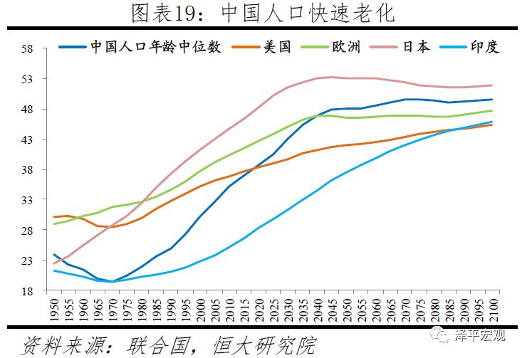 从国际看,1950-2015年中国人口年龄中位数的上升速度仅次于日本。1950-2015年,美国人口年龄中位数从30.2岁升至37.6岁、上升7.4岁,欧洲从28.9岁升至41.6岁、上升12.7岁,日本从22.3岁升至46.3岁、上升24岁,印度从21.3岁升至26.7岁、上升5.4岁。如果仅看1980-2015年,则中国人口老化速度前所未有,该时期美国、欧洲、日本、印度人口年龄中位数分别上升7.6、9.0、13.8、6.5岁,远小于中国的15岁。
