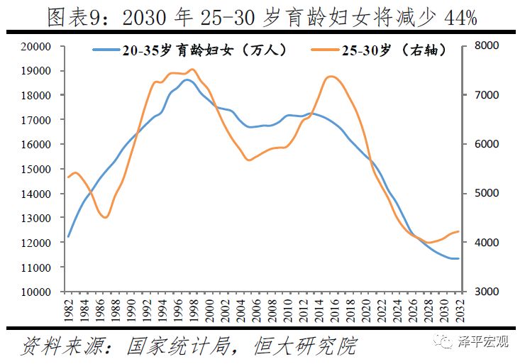 育龄妇女规模已见顶下滑,2030年20-35岁主力育龄妇女规模将比2017年减少31%,其中20-35岁生育旺盛期妇女将减少44%,后续出生人口恐将大幅下滑,预计2030年将降至1100多万、较2017年减少1/3。在修正人口普查数据中的低龄人口漏登后,我们估计了1982-2030年育龄妇女情况。1982年中国15-49岁育龄妇女规模为2.5亿,到2011年达3.8亿人的峰值,2017年降至3.5亿,预计到2030年将降至3.0亿。其中,20-35岁的主力育龄妇女从1982年的约1.2亿增至1997年1.9亿的峰值,到2017年降至近1.7亿,预计到2030年将降至1.1亿;25-30岁生育旺盛期妇女2017年约7200万,预计到2030年将降至约4100万,降幅约44%。在此背景下,预计2030年出生人口将降至1100多万。