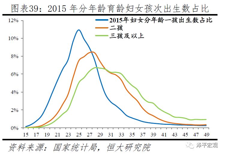 在晚婚的同时,晚育现象也日益突出,初育年龄每推迟一个月,大概会影响总和生育率下降8%左右。1990-2015年女性平均初育年龄从24.1岁推迟至26.3岁,平均生育年龄(所有孩次)从24.8岁推迟至28.0岁。1990年主要初育年龄、主要生育年龄均为20-27岁,生育一孩数、生育子女数占比分别为86.6%、74.9%。而到2015年,主要初育年龄推迟至22-29岁,且生育一孩数占比降至66.7%;主要生育年龄推迟至23-30岁,且生育子女数占比降至59.1%。并且,1990-2015年30岁以上高龄产妇的生育一孩数占比从4.2%增至近19.2%,生育子女数占比14.0%增至32.3%。从2015年小普查数据看,生育一孩、二孩、三孩及以上的平均年龄分别为26.3、29.6、32.0岁。生育一孩、二孩、三孩及以上的育龄妇女年龄分别集中在21-29岁、24-34岁、25-36岁,生育孩次数占比分别为72.0%、73.5%、69.5%。