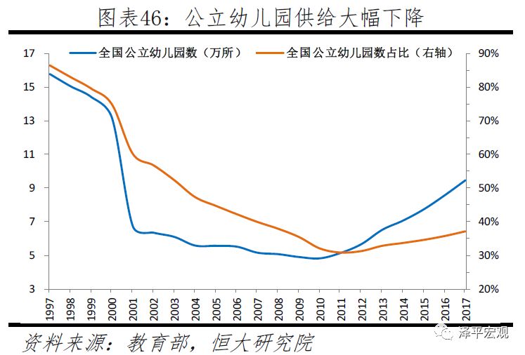 2)教育成本明显攀升,特别是公立幼儿园供给严重不足,1997-2017年中国公立幼儿园在读人数比例从95%降至44%。由于从2006年开始逐渐实行义务教育阶段“两免一补”政策(免除学杂费、免费提供教科书、补助生活费),当前教育成本主要包括幼儿园学杂费、幼儿园及小学初高中阶段辅导班费用、大学学费及生活费等。根据新浪教育《2017中国家庭教育消费白皮书》抽样统计,学前教育阶段教育支出占家庭年收入的26%,义务教育和高中教育阶段占21%,大学阶段占29%。