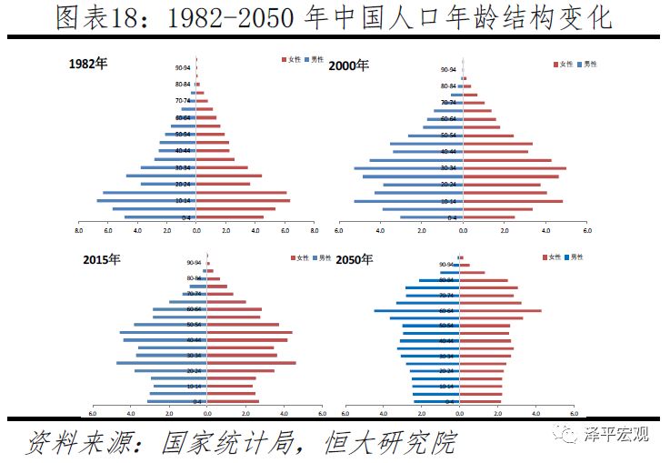2)中国人口快速老龄化,人口年龄中位数从1980年的22岁快速上升至2015年的37岁,预计2030年将升至43岁。人口老龄化有两个含义,狭义指老年人口比重上升,广义的还包括人口年龄中位数上升。持续的低生育率导致人口快速老龄化,中国人口年龄中位数在1950-1980年大多保持在22岁以下,但之后随着生育率持续低迷、中国人口快速老化,到2015年升至37岁;其中,30岁及以下人口占比从1982年的64.4%,降至2000年的50.5%,再降至2015年的40.1%。按照目前趋势,预计到2030年、2050年将分别升至43岁、50岁。