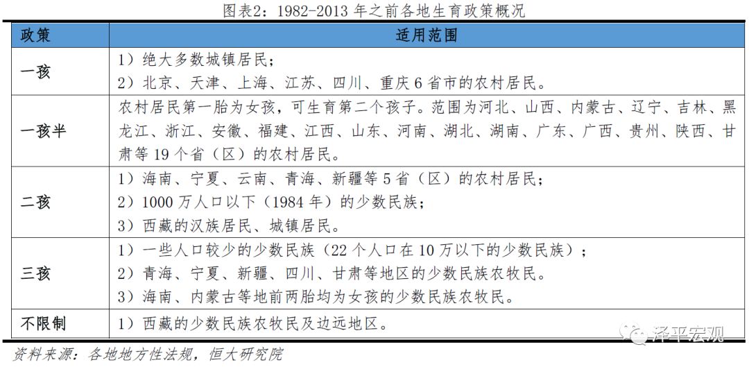 根据社科院蔡昉(2018)统计,2010年之前,独生子女政策覆盖全国35.9%的总人口,一孩半政策覆盖52.9%的人口,二孩政策覆盖9.6%的人口,三孩及以上的政策覆盖1.6%的人口。