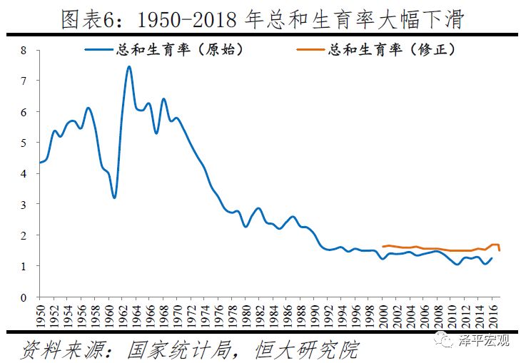 1)1949年以来中国出现了三轮婴儿潮,总和生育率从1970年代之前的6左右,降至1990年的2左右,再降至2010年后的1.5左右,第四轮婴儿潮因长期严格计划生育未能出现。生育数据一般有三种:出生人口、出生率、总和生育率。其中,出生人口和出生率数据一般由国家统计局发布,卫生部门也存在卫生计生分娩活产统计,但2007年之前住院分娩率不足90%,且2016年之前仅包括户籍人口分娩数。总和生育率指每个妇女一生平均生育子女数,但官方数据存在对低龄人口的漏登导致对总和生育率低估。我们基于教育部门的小学生入学数据修正出生人口数(2000-2011年),再经由生育模式将出生人口拆解为各年分年龄分孩次的出生人口,并通过漏报率修正由此计算各年分年龄段分孩次生育率,加总得出修正的2000-2017年总和生育率。与总和生育率相关的一个指标是保持人口规模不变的世代更替率,发达国家人口世代更替率为2.1左右,中国因男女性别比和女性存活率差异为2.2左右。