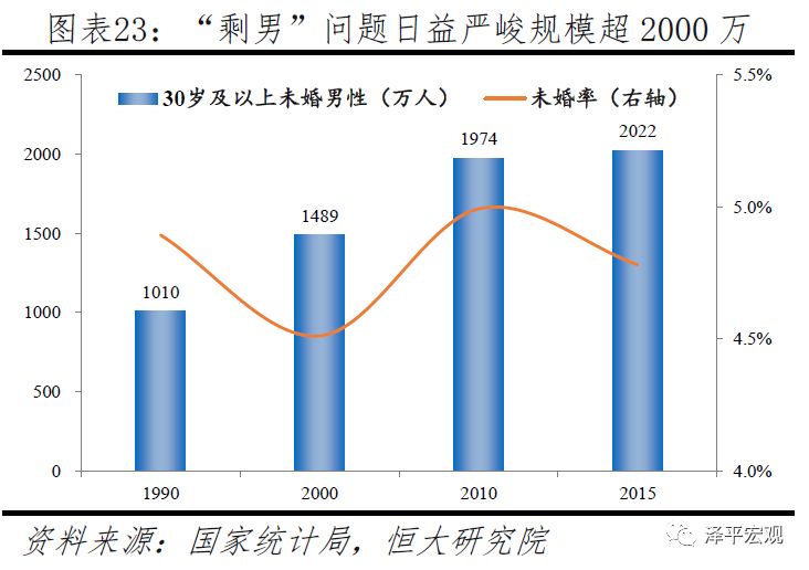2)因婚姻市场匹配问题及单身主义等,“剩女”规模快速增加至约600万,且约6成在城市,学历越高“剩下”的概率越大。在婚姻市场匹配中,女性多偏好不低于自身条件的男性,男性多偏好不高于自身条件的女性。这意味着即便婚姻市场男女性别比平衡,条件最好的女性和条件最差的男性也可能被剩下。中国社科院人口所研究员吴要武等2015年在《经济学季刊》撰文指出,1999年高校扩招后,女性在高等教育群体中开始占主导地位,一方面因为推迟进入婚姻市场,搜寻失败的概率提高;另一方面更多接受了高等教育的女性面对相对减少的潜在配偶供给,匹配困难和失败的风险进一步增大。1998-2017年,本专科招生数从108万增至761万人,研究生招生数从7万增至81万人;其中,在读女生占比从38.3%增至52.2%,2017年女性在读本科生、研究生占比分别为52.5%、48.4%。