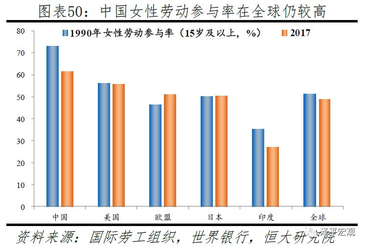 5)女性劳动参与率高但就业权益保障不够,导致生育的机会成本高。生育、看护、培养孩子需要花费大量的时间和精力,这即为家庭、女性的机会成本。女性需要更多平衡职场和家庭,已婚未育女性在职场更易遭受性别歧视。女性劳动参与率与生育率的关系可主要分为两种情况:一是女性参与劳动为家庭带来收入效应,有利于生育。二是在性别歧视度较高的情况下,女性劳动参与率越高,生育的机会成本越大,女性越不愿意生育。