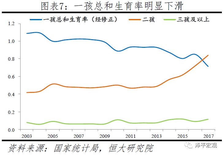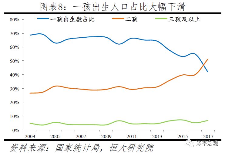 全面二孩政策不及预期,生育堆积效应业已消退,2018年出生人口或降至约1500万以下,即减少13%以上。“单独二孩”和 “全面二孩”政策均未能扭转低迷生育趋势。2014年“单独二孩”放开后,出生人口1687万、仅比2013年增加不到50万。2016年“全面二孩”放开后,出生人口攀至1786万、创2000年以来新高,但2017年就降至1723万。从分孩次生育情况看,2014年以来二孩总和生育率明显回升,这主要在于75后较强的二孩生育意愿集中释放,但一孩生育率走低和育龄妇女规模逐年下滑,预示出生人口后将大幅下滑。2013-2017年二孩总和生育率明显回升,二孩出生人口占比31.1%上升至51.3%。但一孩总和生育率总体下滑,出生人口占比从64.3%大幅下滑至42.0%。一孩总和生育率的明显下滑,意味着不少年轻人连一孩都不愿意生,而没有一孩就不会有二孩。