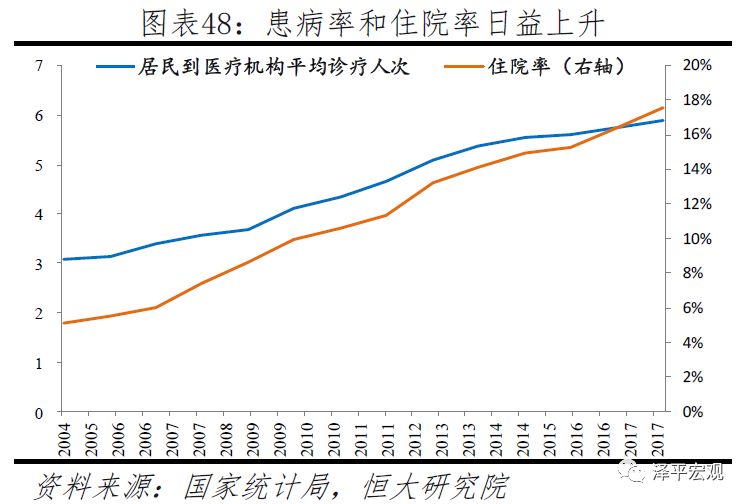 3)医疗费用持续上升,1995-2017年居民医疗保健支出上涨22.4倍,远超可支配收入9.2倍的涨幅。由于环境污染、工作生活压力加大及人口老龄化等原因,患病率上升,病因越来越复杂,一些病症越来越难治、且费用可达百万元级别的天价,“因病致贫”、“因病返贫”的情况长期存在,家庭在做生育决策时必须考虑未来可能的医疗费用。2004-2017年,中国居民平均到医疗机构诊疗人次从3.07人次上升至5.88人次,住院率从5.1%升至17.6%。根据《2017年我国卫生健康事业发展统计公报》,医院人均门诊费用为257元,人均住院费用8891元,日均住院费用959元;其中公立三级医院上述费用分别为306、13088、1334元。
