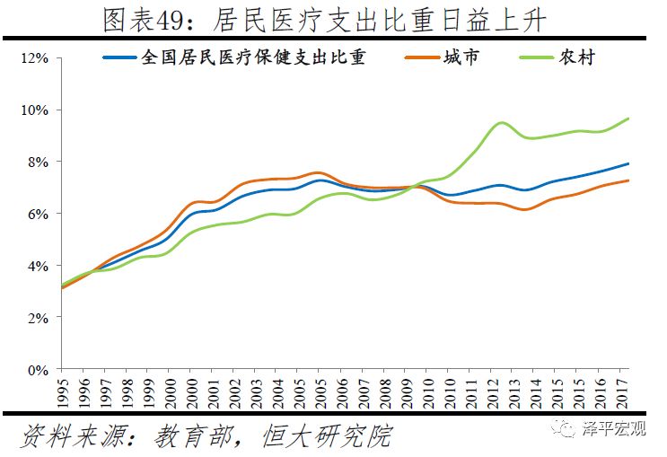 在此影响下,居民医疗费用快速增长,在消费性支出的比重持续上升。1995-2017年全国居民人均医疗保健支出从62元升至1451元,上涨22.4倍,远高于人均可支配收入9.2倍、人均消费性支出8.4倍的涨幅。全国居民人均医疗保健支出占消费性支出的比重从3.2%上升至7.9%,其中城市居民从3.1%升至7.3%,农村居民从3.2%升至9.7%。因此,尽管个人卫生支出占国家卫生总费用比例从2001年的60.0%下滑至28.8%,但居民仍普遍觉得医疗费用仍然较高。