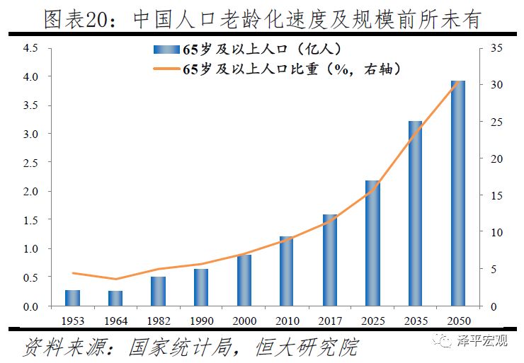 同时,中国老年人口规模及比重快速上升,速度之快、规模之大在世界前所未有,预计到2050年65岁及以上人口比重达约30%,届时每3.3个中国人中将有1个65岁以上的老人。一般认为,65岁及以上人口比例在7%以上为老龄化社会,14%以上为深度老龄化,20%以上为超级老龄化。从老龄化过渡到深度老龄化,法国用了126年、英国46年、德国40年、日本25年(1970-1994年);从深度老龄化到超级老龄化,德国用了36年(1972-2008年),日本用了21年(1995-2006年)。中国1982年65岁及以上人口占比仅为4.9%,2001年占比超过7%、进入老龄化社会,2017年占比达11.4%,我们预计中国将用约22年、即于2023年前后进入深度老龄化社会,再10年后即2033年前后进入超级老龄化社会,2050年达30.0%,老龄化速度前所未有。并且,由于人口基数大,中国老年人口规模也是前所未有。2017年中国65岁及以上人口已达1.6亿,预计到2050将达3.9亿,届时约每3.3个人中就有1个65岁以上的老人。