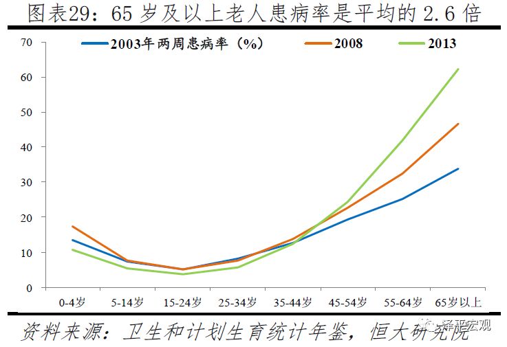 并且,随着老龄化加剧,医疗支出压力也将越来越大。根据国家卫生服务调查,2003-2013年中国调查地区居民两周患病率(患病人次数/调查人数)从14.3%增至24.1%;其中65岁及以上人口患病从33.8%增至62.2%,2013年老年人口的患病率是平均水平的2.58倍。