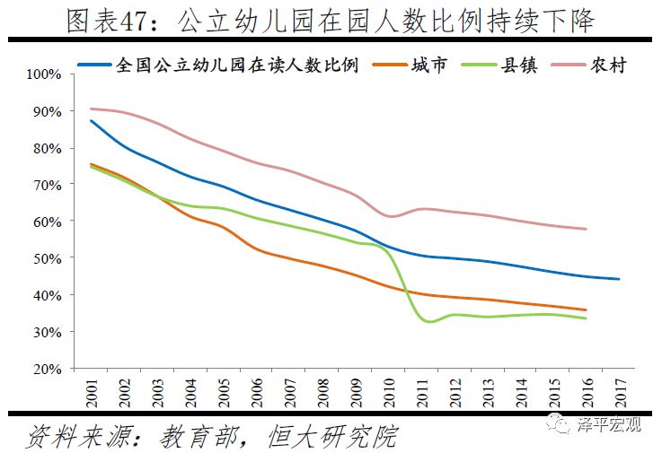 公立幼儿园供给大幅下降,许多家庭被迫选择价格昂贵的私立幼儿园,是学前教育费用高昂的一个重要原因。根据教育部分类,幼儿园分为教育部门办、集体办、民办、其他部门办。1997年,中国公立幼儿园数达18.2万所,其中公立幼儿园数占比86.5%,在园人数占比94.6%。从2001年开始,幼儿园被大量推向社会办学,加上基层中小学大量撤点并校,特别是在农村,导致农村、县镇、城市幼儿园分别大幅减少4、1.5、0.9万所。2001-2017年全国幼儿园所数从11.2万增至25.5万所,公立幼儿园数从6.7万所减少至2010年的4.8万所,再回升至2017年为9.5万所,占比从60.1%降至30.7%再回升至37.1%;但公立幼儿园在园人数占比未有回升,从83.1%持续降至44.1%。分城乡看,2001-2017年城市、县镇、农村的公立幼儿园所数占比从56.3%、43.9%、71.6%分别降至23.2%、32.4%、53.7%。城市、县镇、农村的公立幼儿园在园人数占比分别从75.5%、74.8%、90.6%上升至2016年的35.7%、33.4%、57.7%。