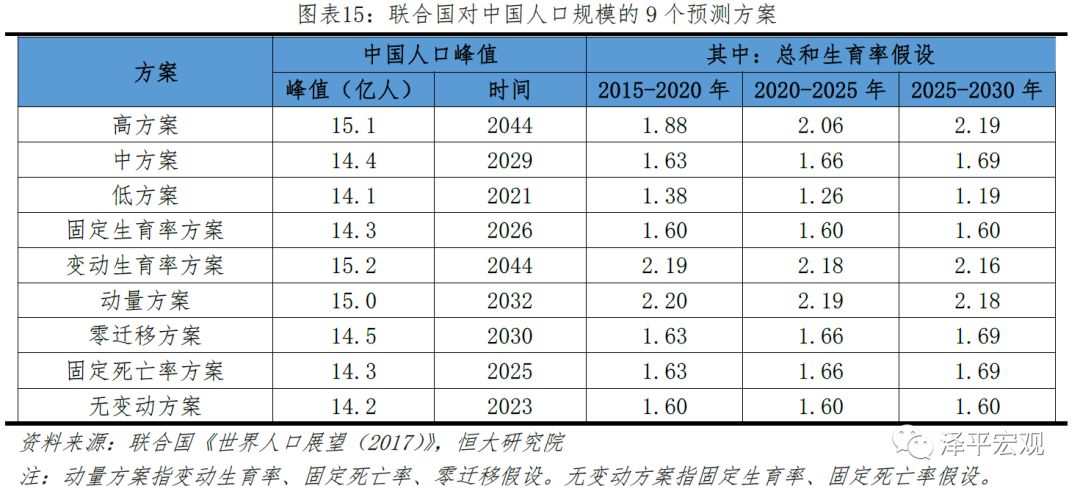 联合国《世界人口展望(2017)》对人口规模有9个预测方案,基于不同假设预测的中国人口峰值最早在2021年,最晚在2044年,其中有7个方案预测的峰值在2032年及之前。无变动方案和固定生育率方案对未来综合生育率假设均为1.60,比较接近现实,预测的人口峰值分别出现在2023、2026年,峰值分别为14.2亿、14.3亿人。