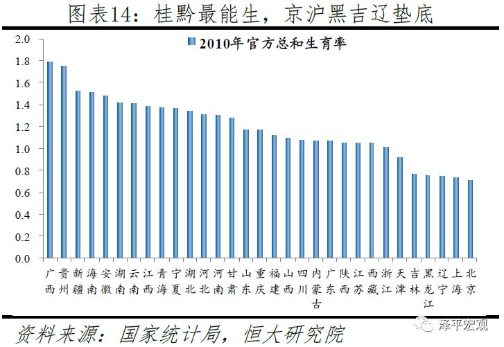 3)分省看,山东出生人口及出生率居首,桂黔生育率最高,京沪、黑吉辽生育率垫底。从出生人口看,2017年出生人口超过百万有山东(175万)、广东(152万)、河南(140万)等3个省,合计占全国的27%。从出生率看,山东、西藏、新疆、广西、福建等5省均超过15‰,而黑龙江、辽宁、吉林、天津、上海、内蒙古、北京等7省不到10‰,东北三省甚至不到7‰。从总和生育率看,根据2010年人口普查资料,广西、贵州均超过1.7,而北京、上海、辽宁、黑龙江、吉林则不到0.8。