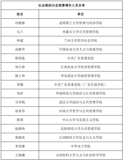 中国农业大学人文与发展学院副教授高静华、南京大学政府管理学院副教授霍萱、海南大学国际旅游和公共管理学院副教授王强、暨南大学人文学院副教授李琴被增补为社会救助分会副秘书长。