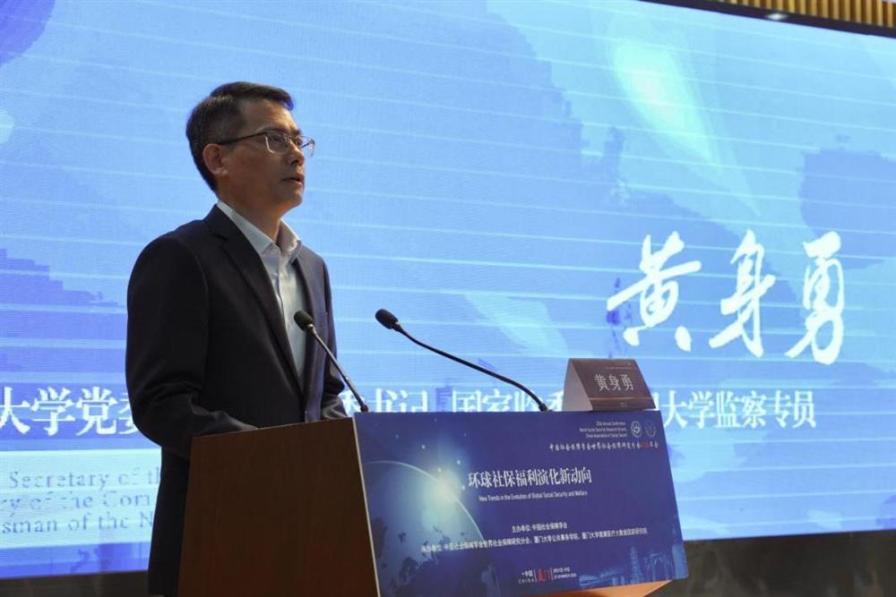 厦门大学党委副书记、纪委书记、国家监委驻厦门大学监察专员黄身勇为会议致辞。他代表厦门大学向参会的国内外专家学者致以诚挚欢迎,指出当前全球社会保障体系面临人口老龄化、数字技术变革等多重挑战,本次年会以“环球社保福利演化新动向”为主题,汇聚了来自多国的顶尖学者与实务专家,具有重要的学术价值与现实意义。厦门大学期待以本次年会为契机,在比较视野与本土实践的交汇中产出高质量研究成果,在全球社会保障研究中贡献厦大声音,为全球社会保障事业高质量发展贡献智慧与力量。