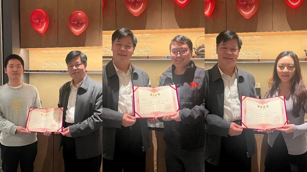 郑功成为张圣和、范世明、雷悦橙颁发先进工作者与优秀志愿者证书(从左至右)