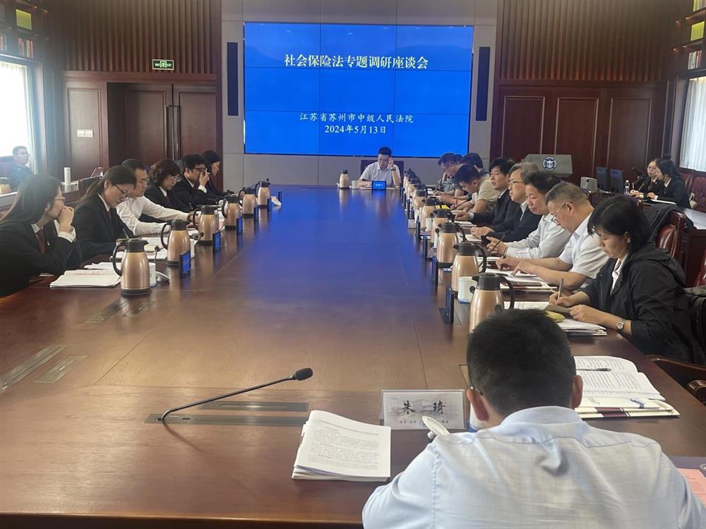 5月13日下午,调研组一行在苏州市中级人民法院召开社会保险案件情况专题调研会。苏州市人大社会建设委、苏州市中级人民法院及其执行局、劳动法法庭、刑事审判第二庭、行政审判庭负责人参加座谈会。调研组一行听取了有关苏州市人民法院劳动法庭成立以来工作情况的报告,听取了有关社会保险民事诉讼领域的情况报告、有关社会保险行政诉讼领域的情况报告、有关社会保险刑事诉讼领域的情况报告、有关社会保险案件纠纷执行情况报告。调研组成员与他们围绕社会保险及与之相关的案件情况及法律问题进行了深入交流。