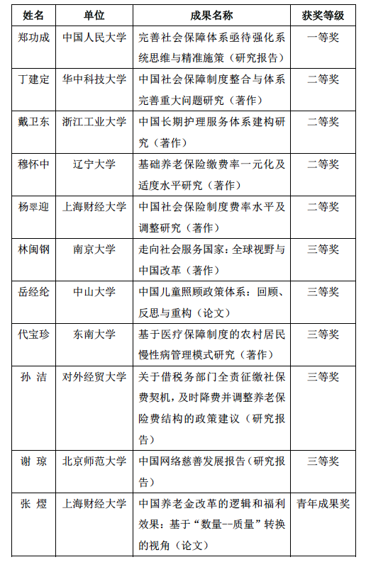 近日,教育部正式公布了第九届高等学校科学研究优秀成果奖(人文社会科学)获奖成果名单,由我会成员申报的11项社会保障研究成果获奖,其中:一等奖1项、二等奖4项、三等奖5项、青年成果奖1项,获奖名单附后。这批重要成果集中反映了2018年1月1日至2021年12月31日四年间全国社会保障学界的研究水准。