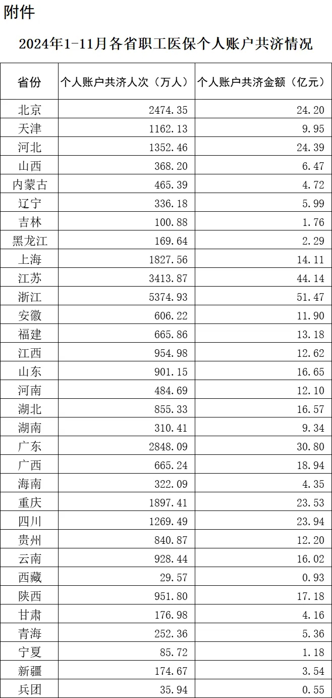 二、2024年1-11月职工医保个人账户共济3.25亿人次,比1-10月增长0.42亿人次;共济金额444.53亿元,比1-10月增长75.45亿元。