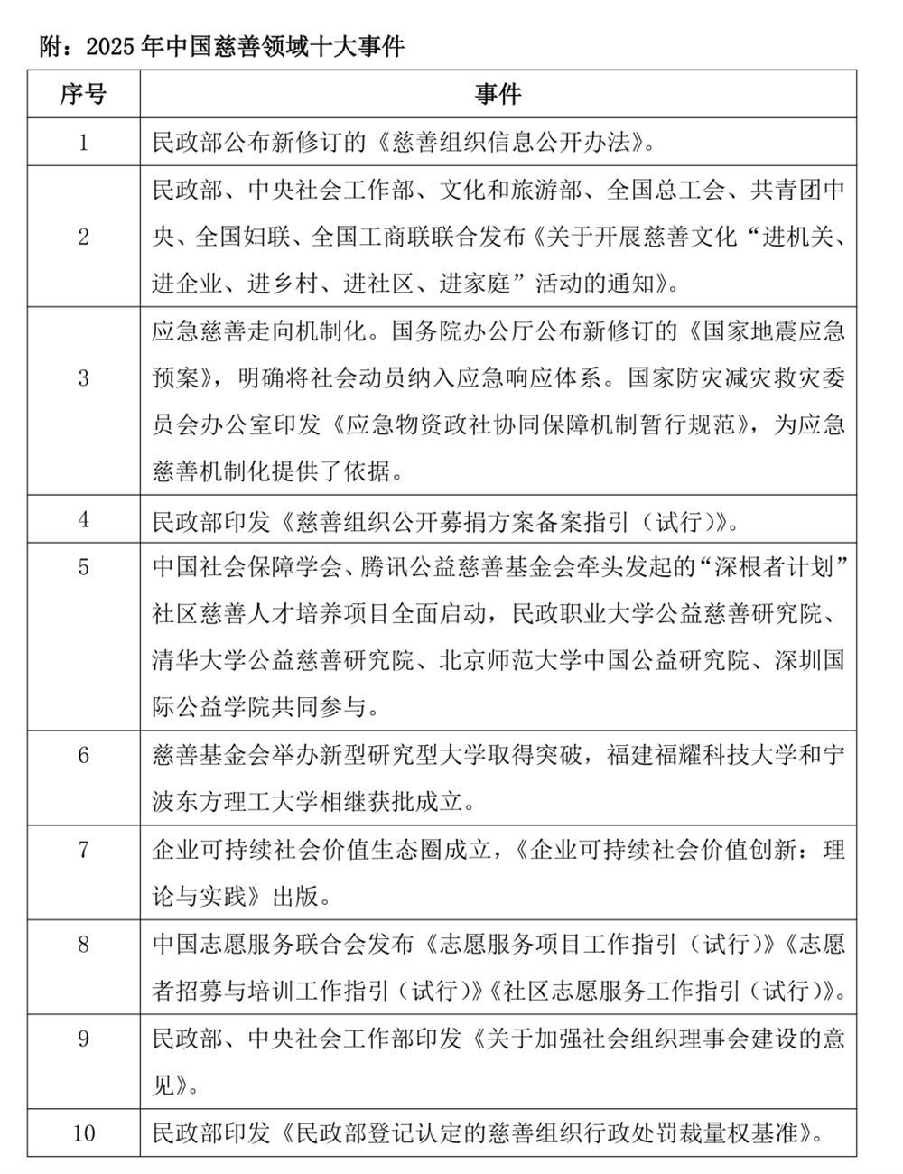 根据投票结果,2025年度中国慈善领域十大事件排序如下:民政部公布新修订的《慈善组织信息公开办法》;民政部等多部门联合发布《关于开展慈善文化“进机关、进企业、进乡村、进社区、进家庭”活动的通知》;应急慈善走向机制化;民政部印发《慈善组织公开募捐方案备案指引(试行)》;中国社会保障学会、腾讯公益慈善基金会启动“深根者计划”;慈善基金会举办新型研究型大学取得突破;企业可持续社会价值生态圈成立;中国志愿服务联合会发布《志愿服务项目的工作指引(试行)》《志愿者招募与培训的工作指引(试行)》《社区志愿服务的工作指引(试行)》;民政部、中央社会工作部印发《关于加强社会组织理事会建设的意见》;民政部印发《民政部登记认定的慈善组织行政处罚裁量权基准》。这些入选事件集中展现了2025年我国慈善领域改革与发展的重要进展。