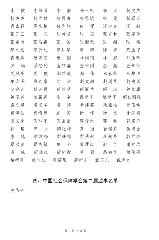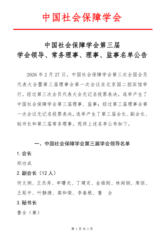 中国社会保障学会第三届 学会领导、常务理事、理事、监事名单公告